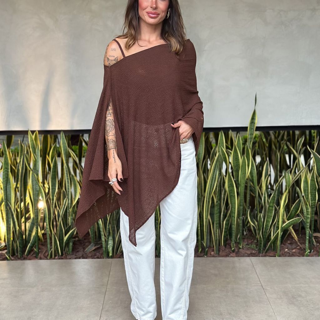 Aposte na elegância e versatilidade da Blusa Capa Marrom. Confeccionada em tecido de malha vazada, essa peça proporciona leveza e um caimento impecável, perfeita para compor looks modernos e estilosos em qualquer ocasião.