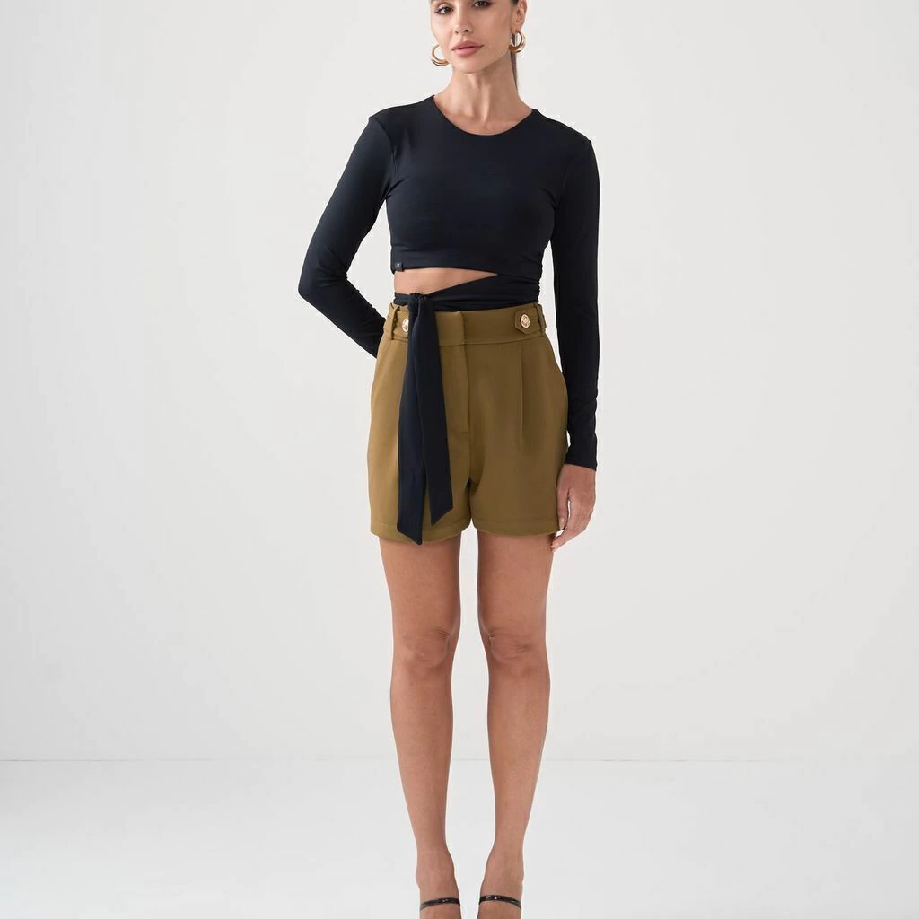 Blusa manga longa, detalhe de amarração na parte debaixo, possiu forro duplo, tecido encorpado com muito elastano.