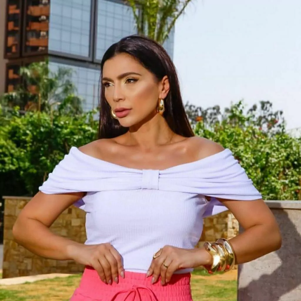 Blusa de modelagem ombro a ombro, malha canelada com elastano, possui detalhe frontal.