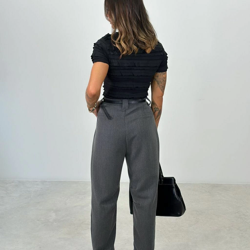 A Calça de Alfaiataria Chumbo é extremamente versátil: combine com blusas sociais para um look de trabalho refinado, ou aposte em camisetas para um toque mais descontraído. Use com salto para um visual sofisticado, ou com tênis para modernidade e conforto em qualquer momento do dia.