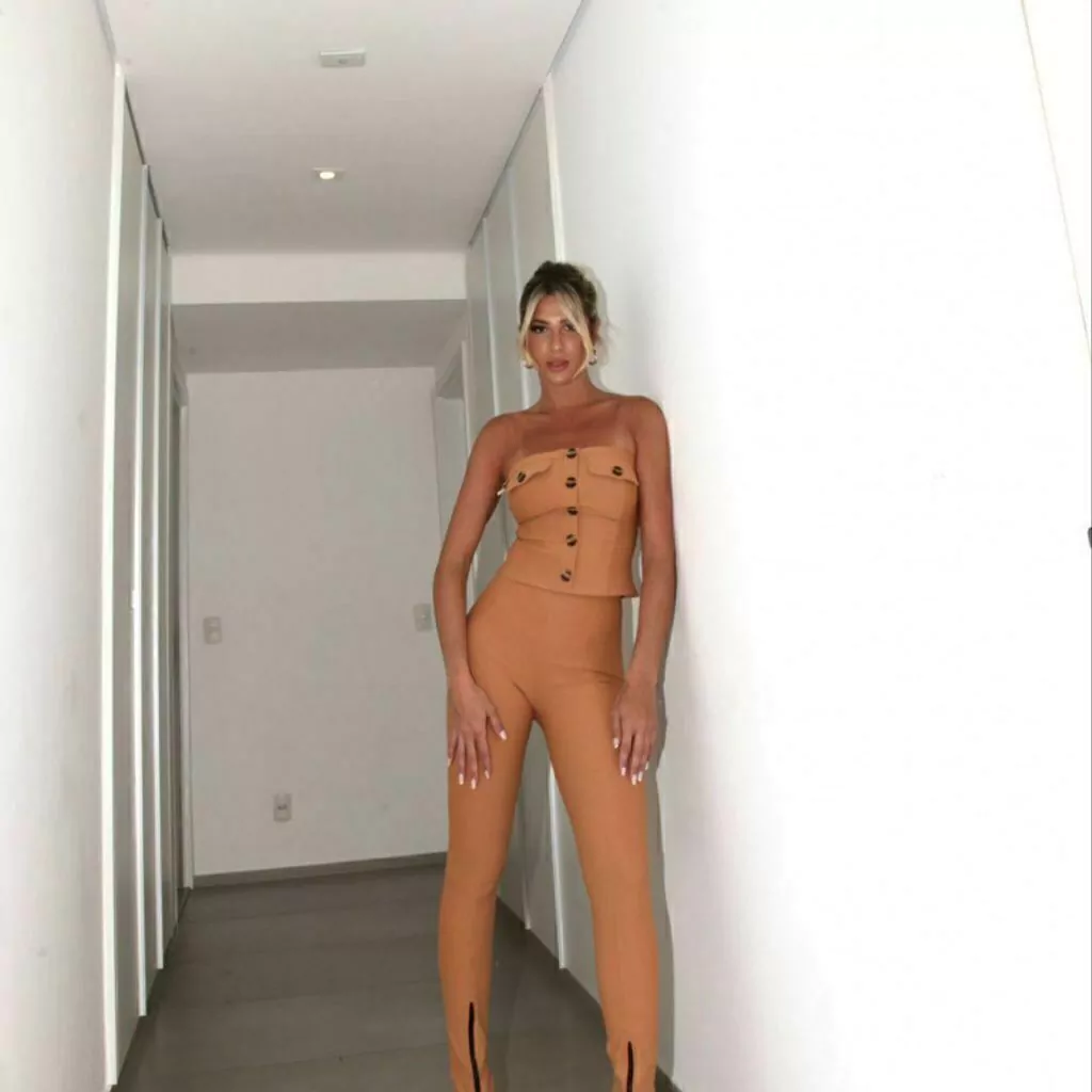 Calça Caramelo, tecido com bastante elastano, encorpado que modela o corpo.