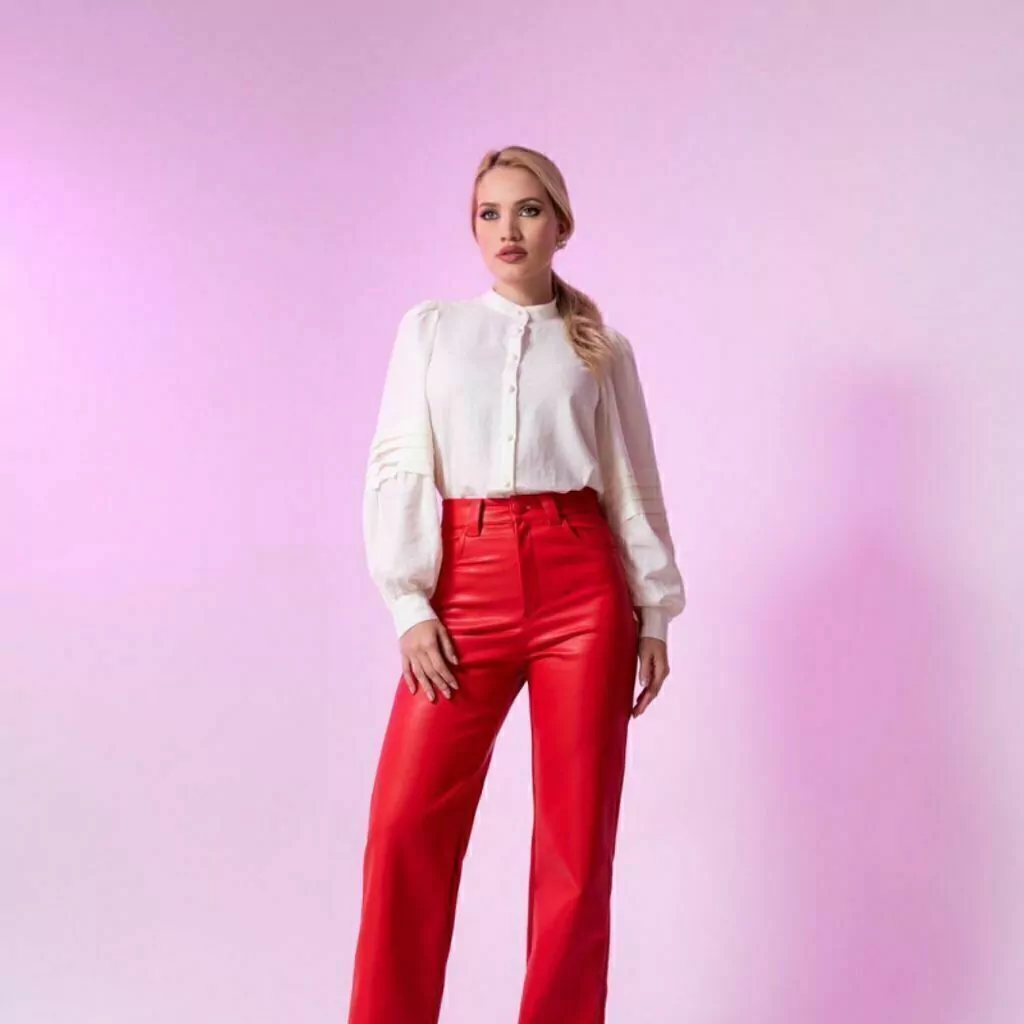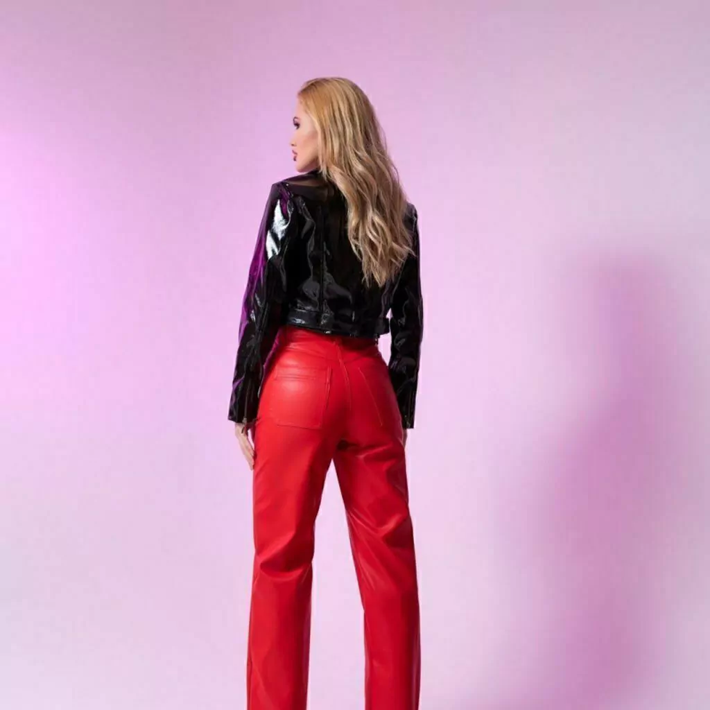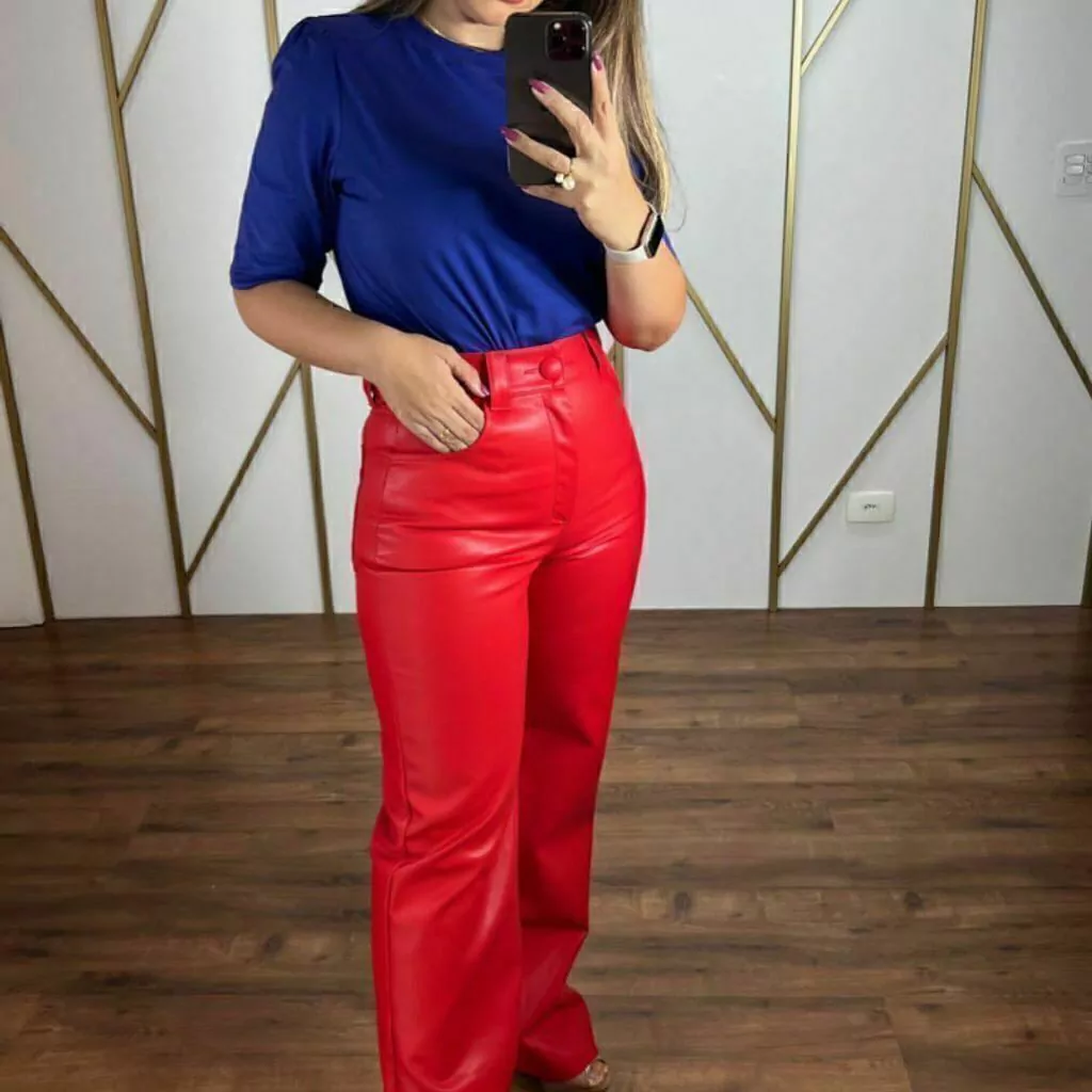 Calça Vermelha cintura alta em tecido de couro sintético possui passantes para cinto, bolsos laterais e bolsos na parte de trás.