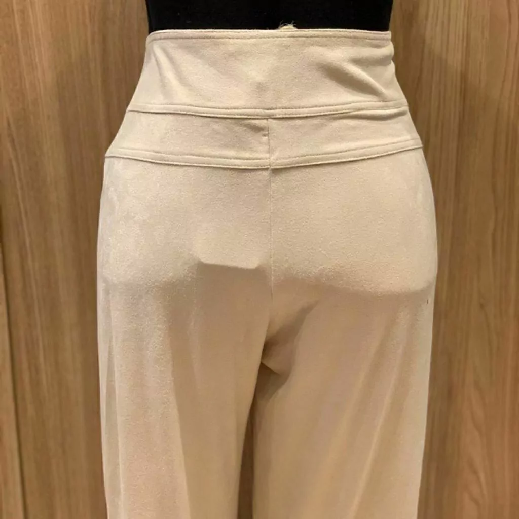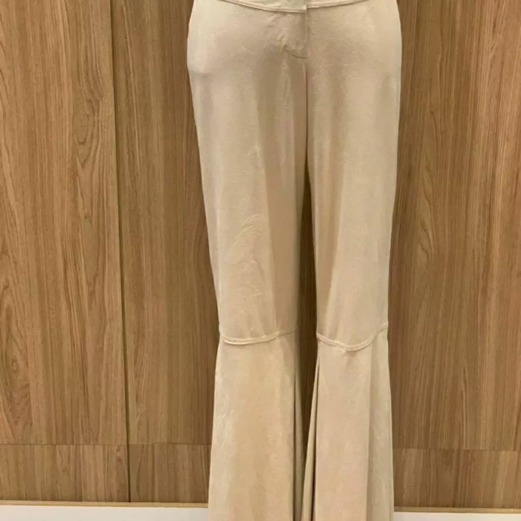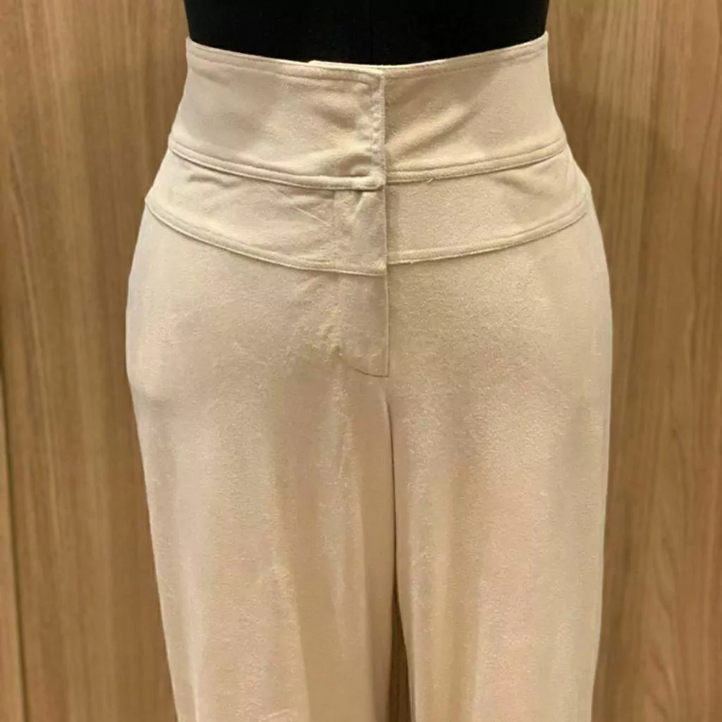 Calça Flare em tecido suede com elastano, cós largo, fechamento em zíper e colchetes.