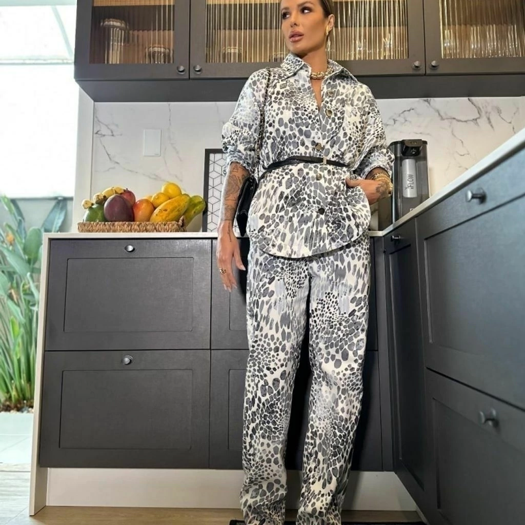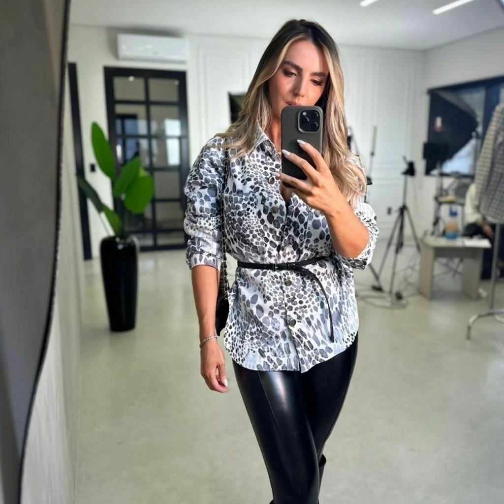 Camisa estampada, possui botões frontais funcionais, tecido sarja com elastano.