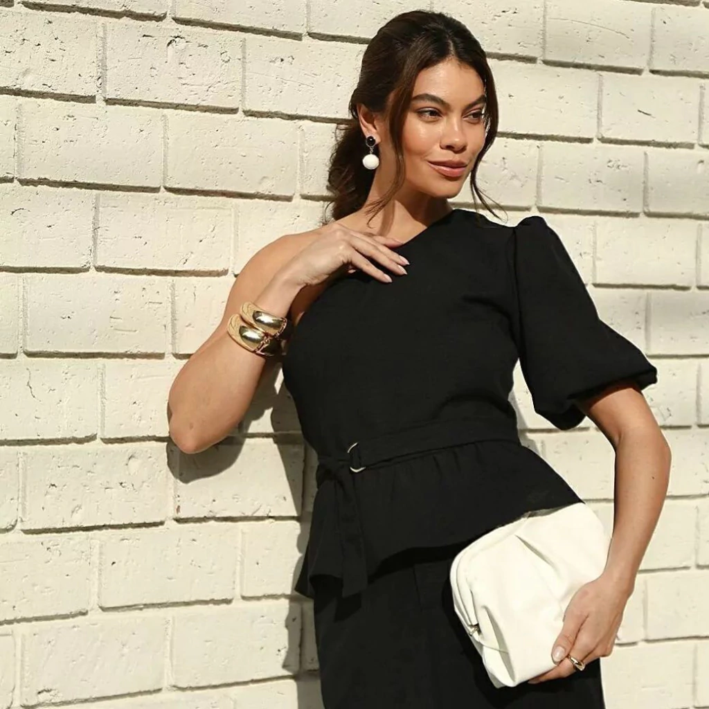- Blusa um ombro só: Modelagem assimétrica que valoriza o colo e traz um toque contemporâneo ao visual.