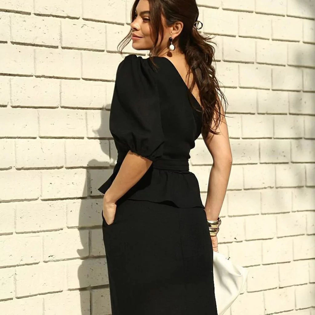 Invista no Conjunto Blusa um Ombro Só e Saia Midi Preta e sinta-se confiante, estilosa e confortável em qualquer ocasião!