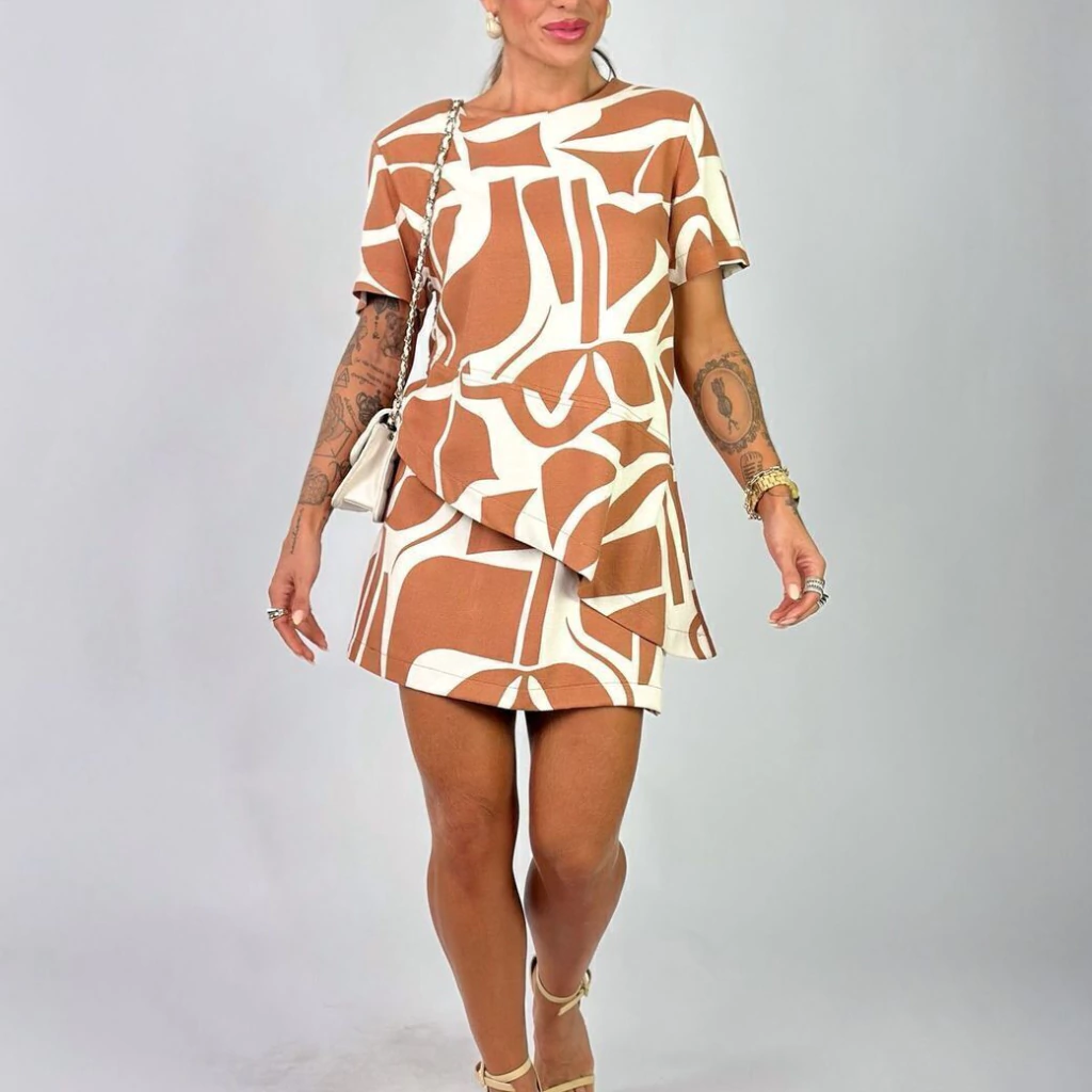Invista no Conjunto Doce De Leite Blusa e Saia Estampado e sinta-se única em qualquer ocasião. Aposte neste look que une sofisticação, conforto e personalidade para transformar seu visual!