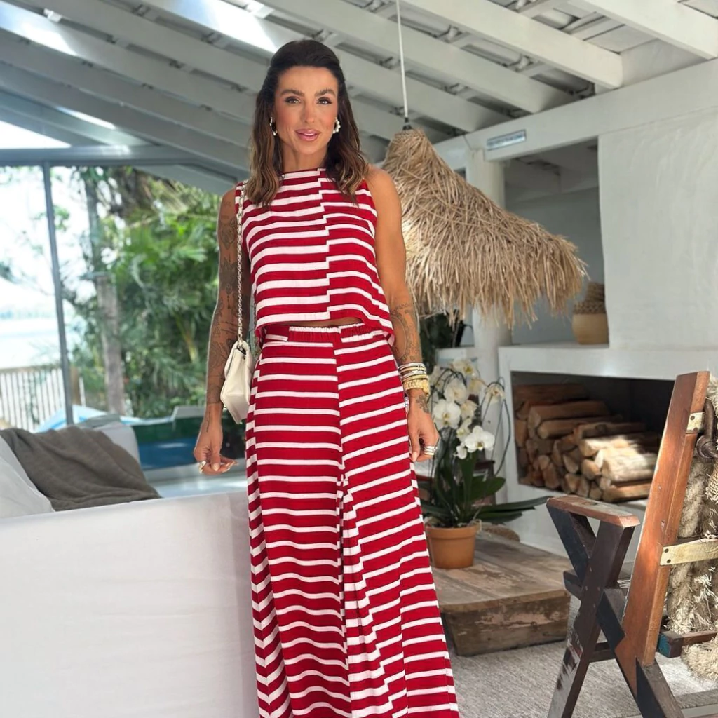 Invista no Conjunto Listras Blusa e Saia Midi Vermelho Nathaly e destaque-se com sofisticação, conforto e personalidade em todos os momentos!