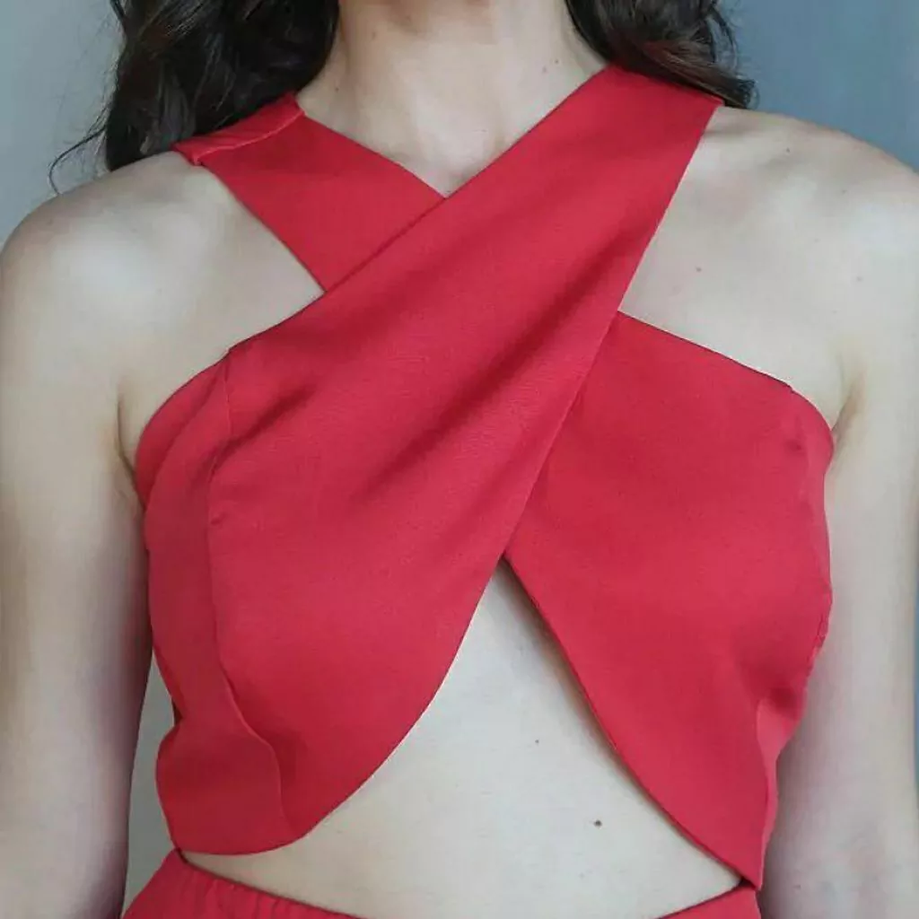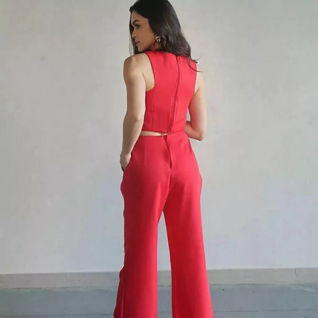 Conjunto confeccionado em crepe alfaiataria, cropped com decote x, fechamento em zíper na parte posterior, calça de modelagem pantalona.