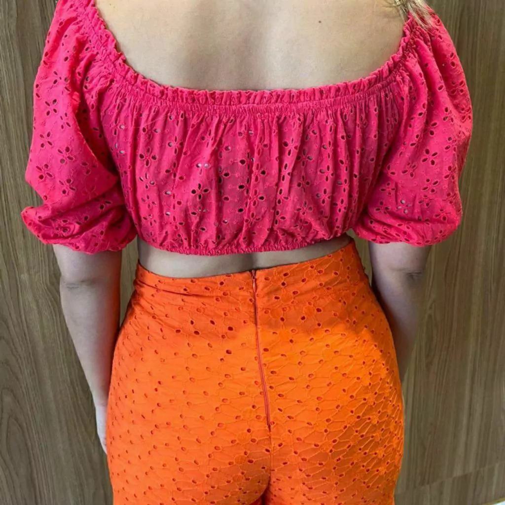 Cropped de Laise, com forro na parte frontal, mangas bufantes que podem ser ajustadas e usadas ombro a ombro.