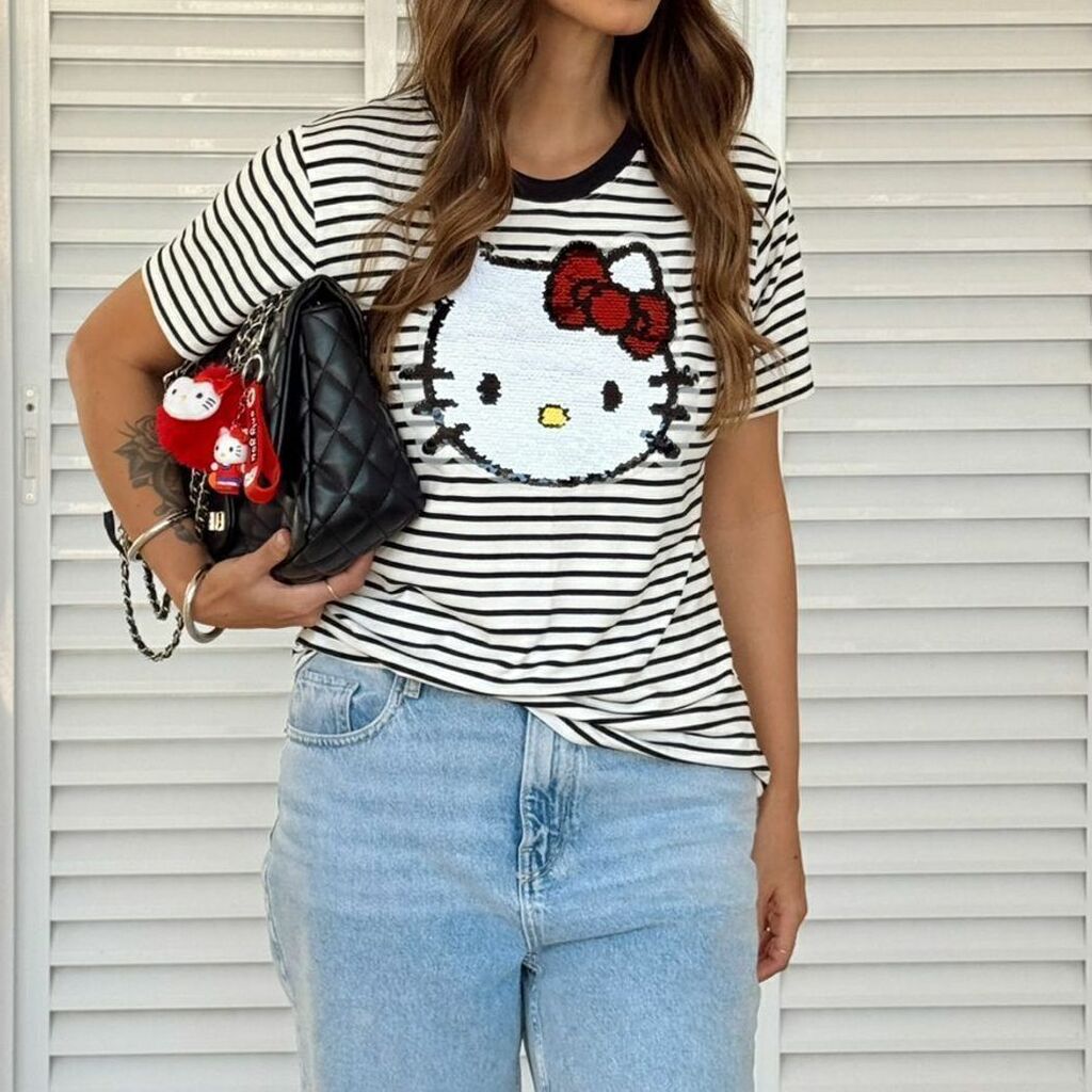 Aproveite para garantir já a sua T-Shirt Listra com estampa Hello Kitty e transforme seus looks com muita fofura e autenticidade!