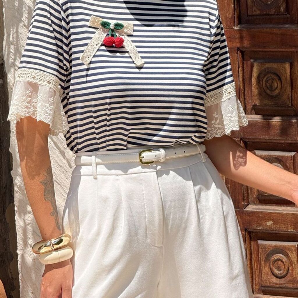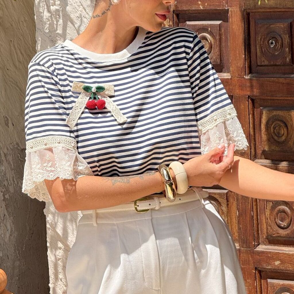 Renove seu guarda-roupa com a T- Shirts Listra Azul Marinho com Cereja, uma peça que combina elegância atemporal com um toque moderno e descontraído. Ideal para quem valoriza conforto, versatilidade e estilo em todos os momentos do dia.